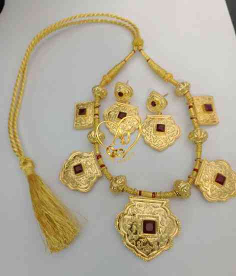 Handcrafted brass bridal necklace set with a layered choker and cascading strands of golden beads accented with rich red drops. Includes matching jhumka earrings and a maang tikka, and is dipped in 24‑carat gold water for lasting radiance. Comes with a one‑year anti‑tarnish warranty at wholesale rates.