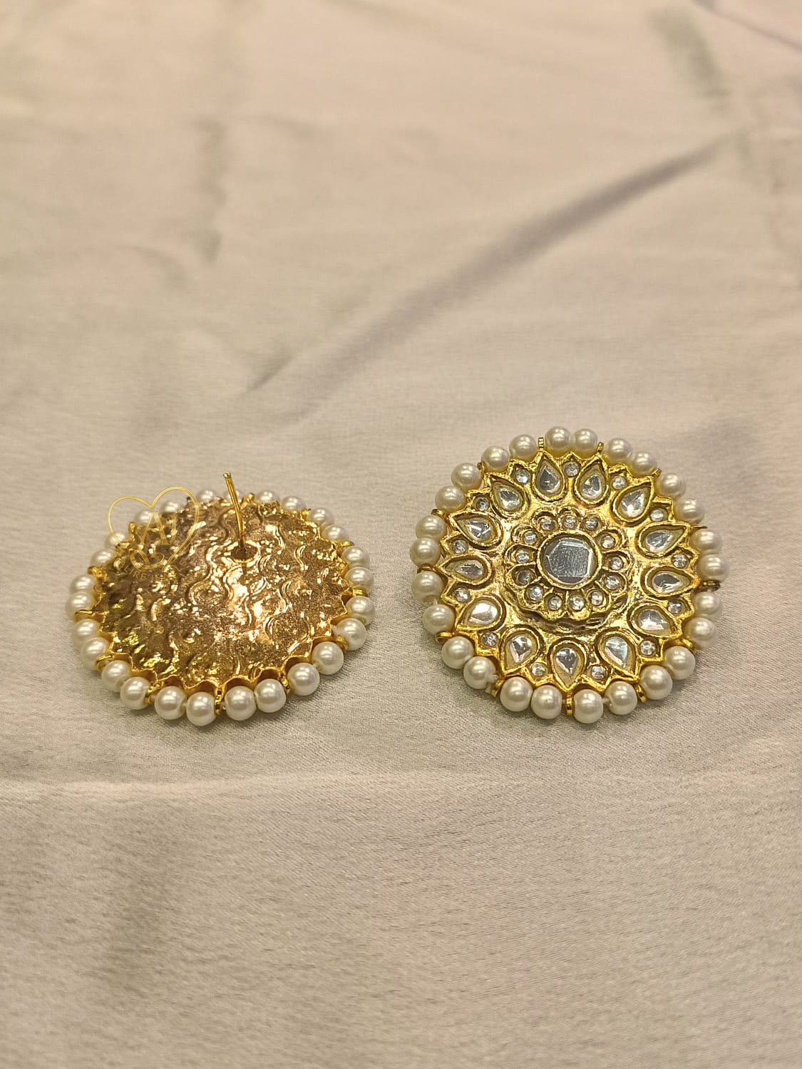 Round Kundan Stud Earrings – 24K Gold Plated with Pearl Border