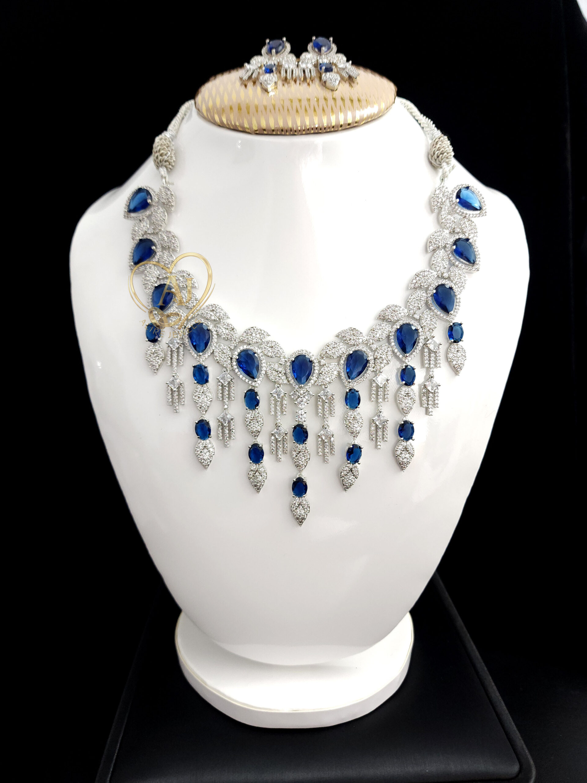 Experience premium elegance with ALIRE JEWELS Blue Sapphire Inspired Necklace Set. This exquisite design features sparkling silver-tone plating with deep blue sapphire-inspired stones, creating a royal and luxurious look. The set includes a stunning necklace paired with matching earrings, making it perfect for weddings, parties, and grand occasions. Crafted with attention to detail and an anti-tarnish finish, ALIRE JEWELS ensures long-lasting shine, quality, and elegance.