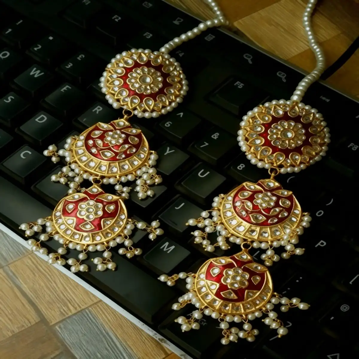 Luxury 24K gold plated Kundan chandbali earrings with pearl tassels and bead drops (available in multiple colors). Elegant, festive, and backed by a 1-year anti-tarnish warranty.