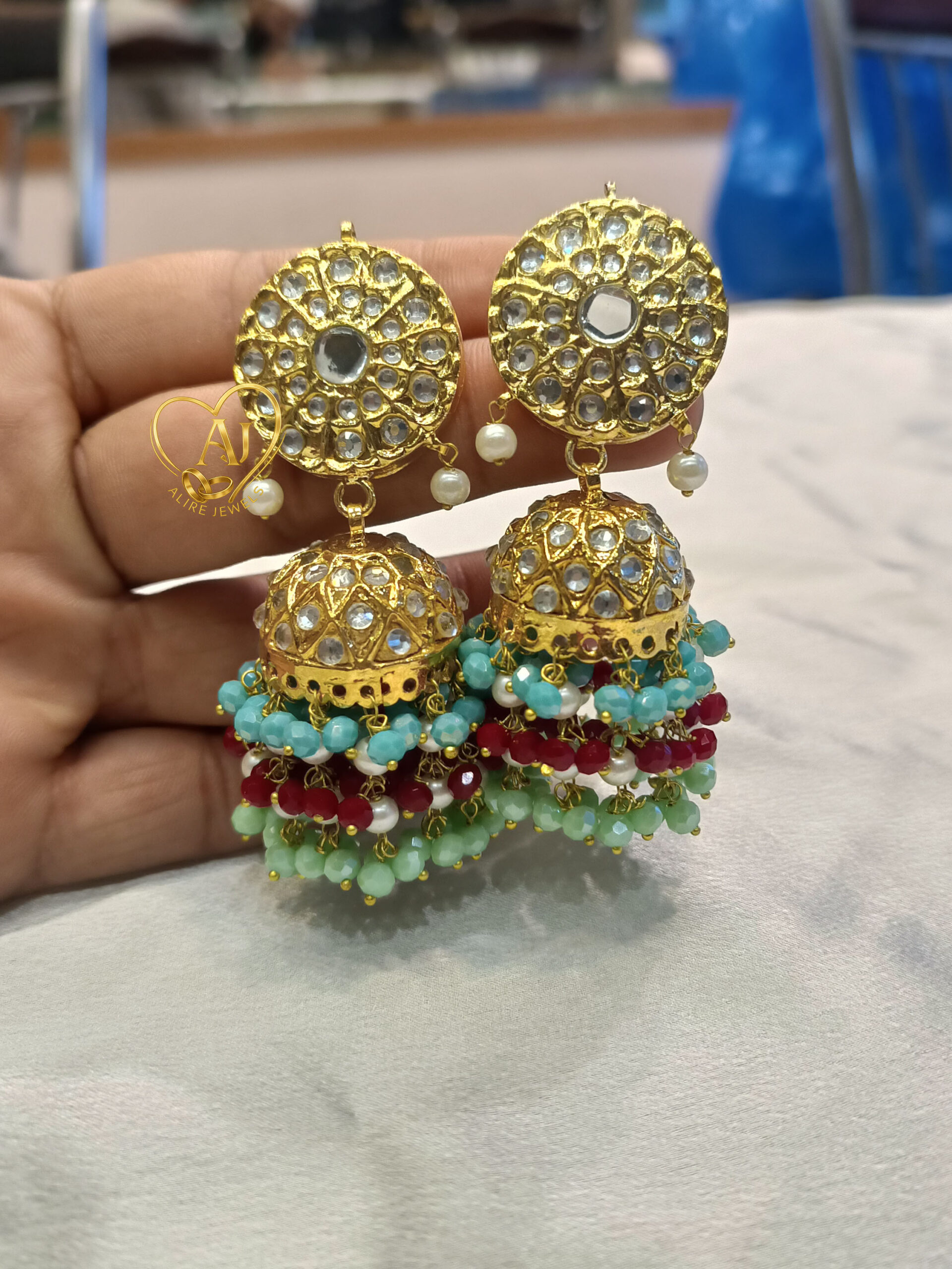 • Handcrafted Kundan Jhumka – Dome-shaped jhumkas with crystal kundan stones and floral tops.