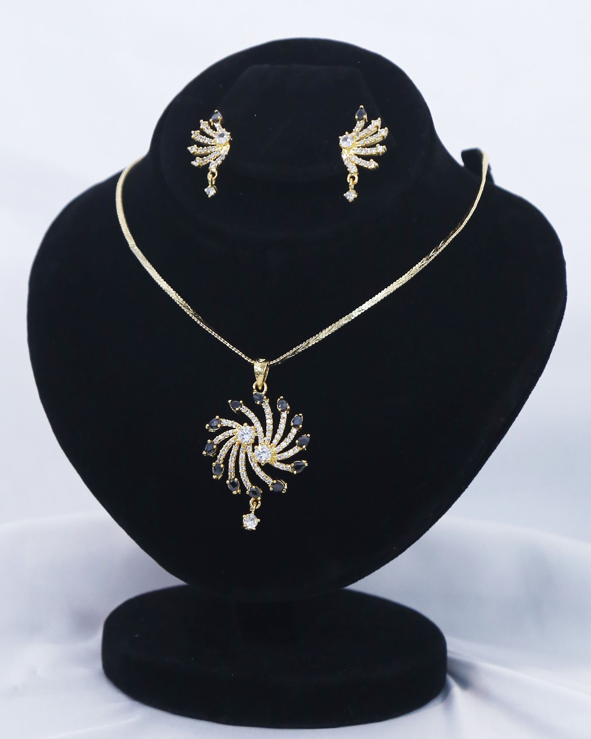 Shine with modern elegance in the Galaxy Swirl Zircon Set. Designed with a unique swirl pattern that mimics a galaxy starburst, this set includes a sparkling pendant and matching earrings. Lightweight and versatile, it’s perfect for both casual evenings and formal occasions.