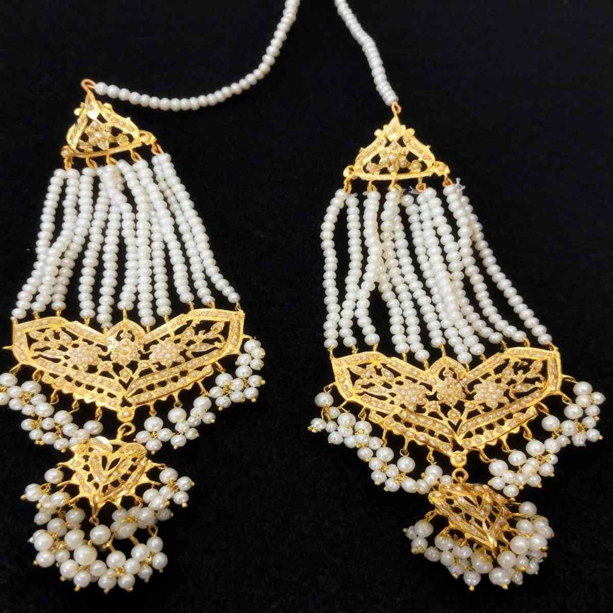 Handcrafted Kundan earrings in 24K gold plating, detailed with pearl tassels and fine stonework. Lightweight, elegant, and covered with a 1-year anti-tarnish warranty.