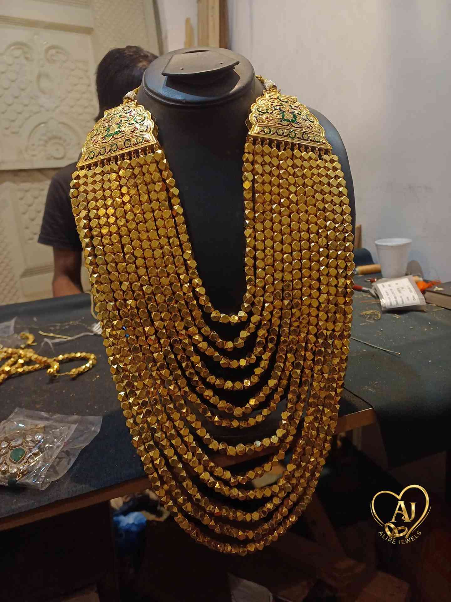 A traditional Multani mala made from handcrafted brass beads arranged in cascading layers for an elegant drape.