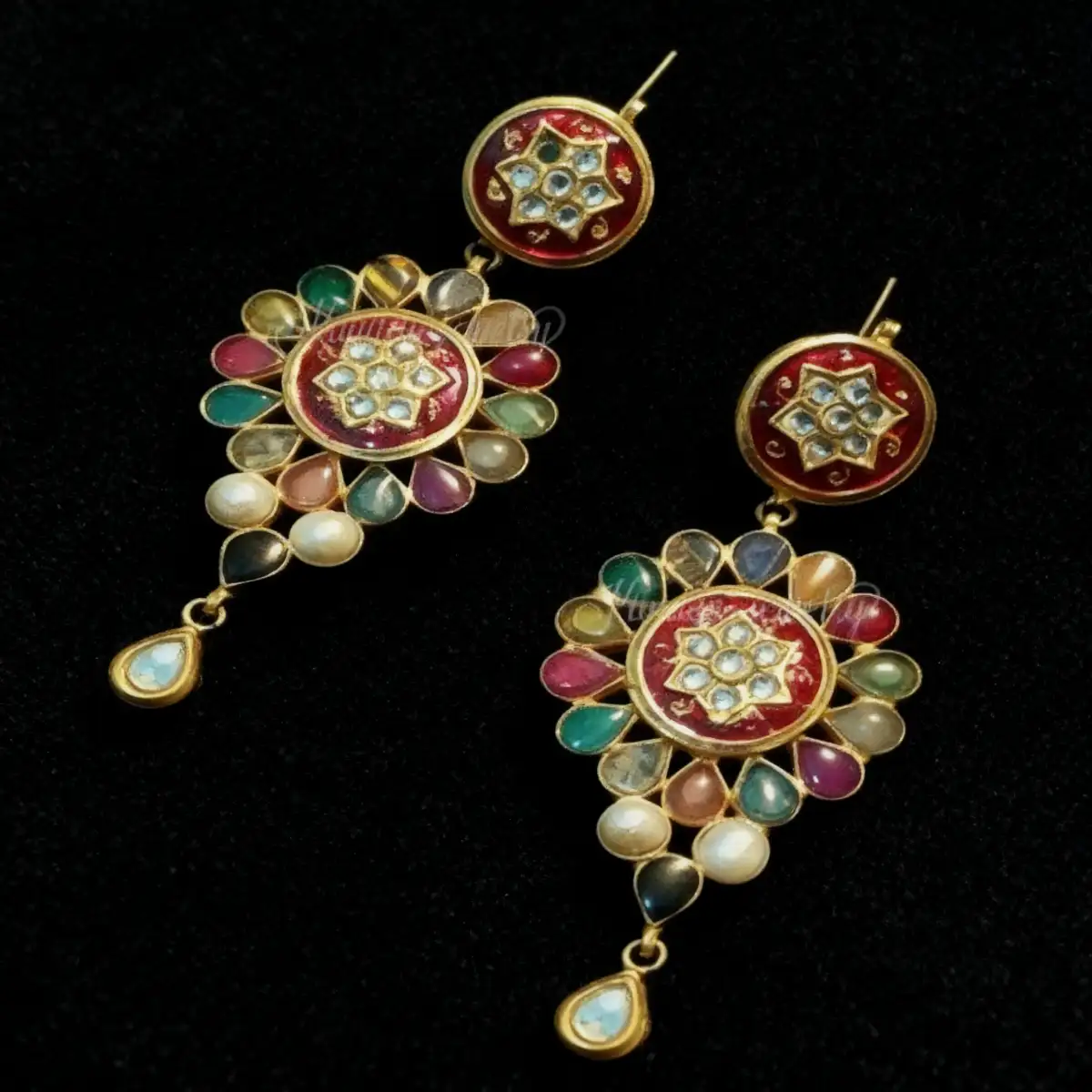 Kundan Jhumka Earrings 24K Gold Plated – Red, Blue & Pearl Beads