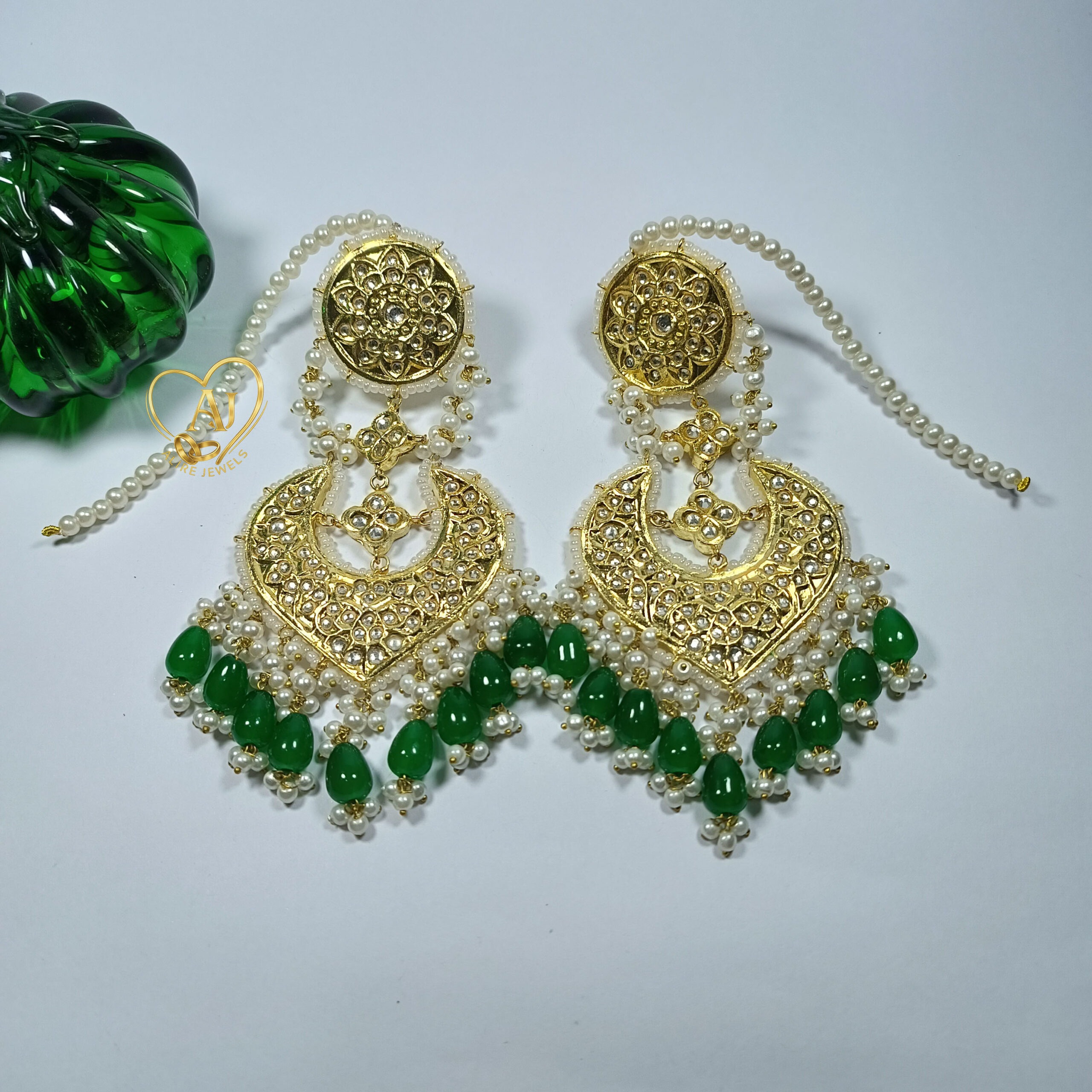 Chandelier-style kundan earrings with pearl strings and green bead drops. 24K gold plated and backed by a 1-year anti-tarnish warranty.