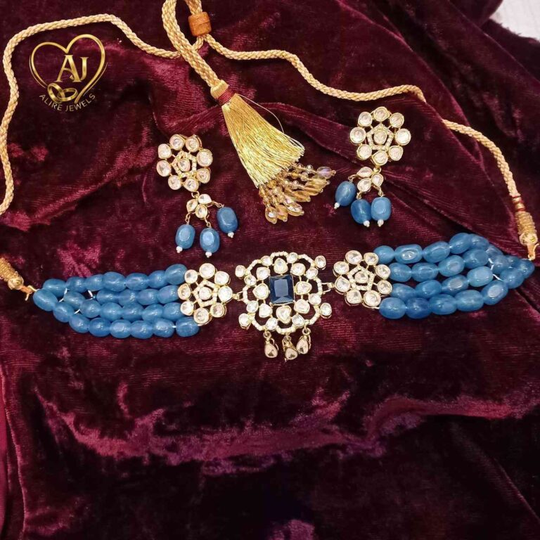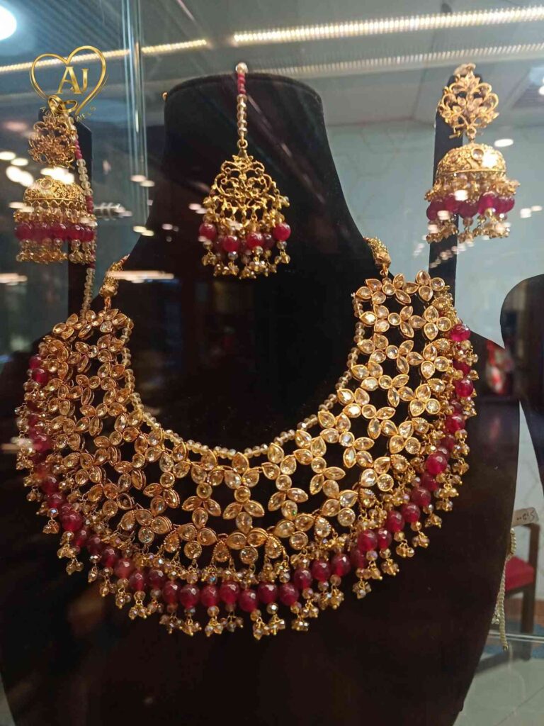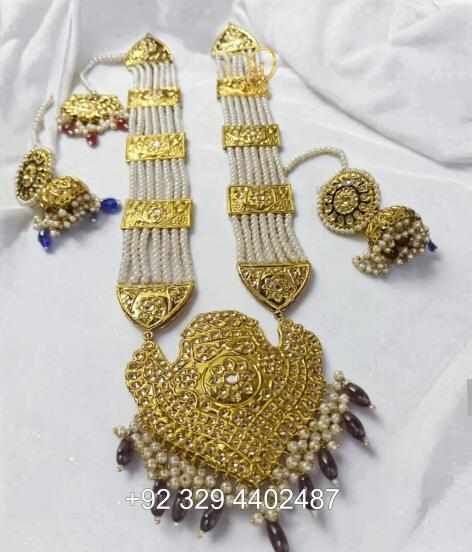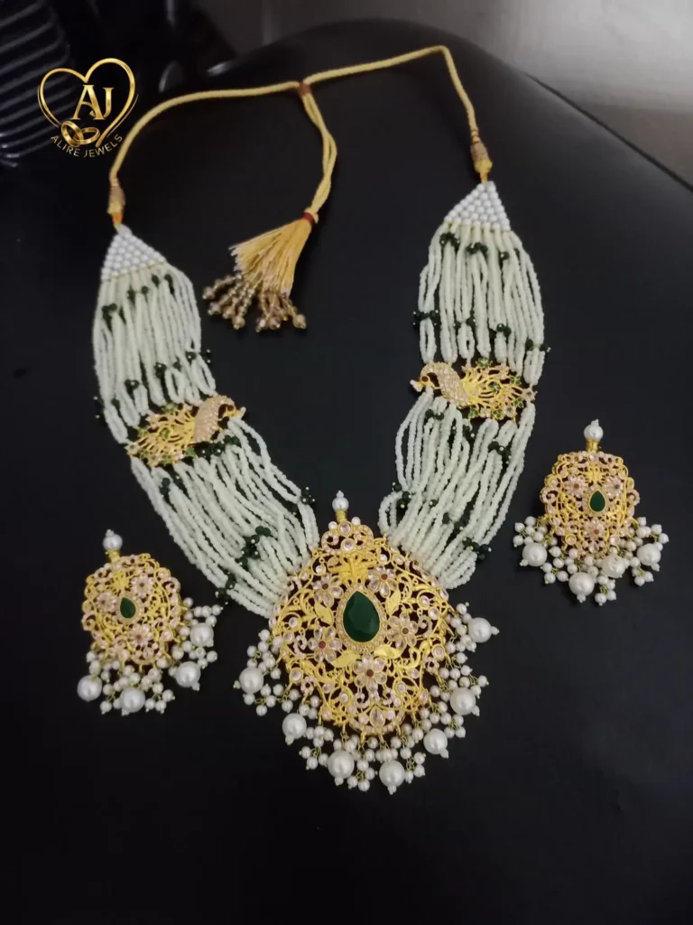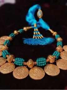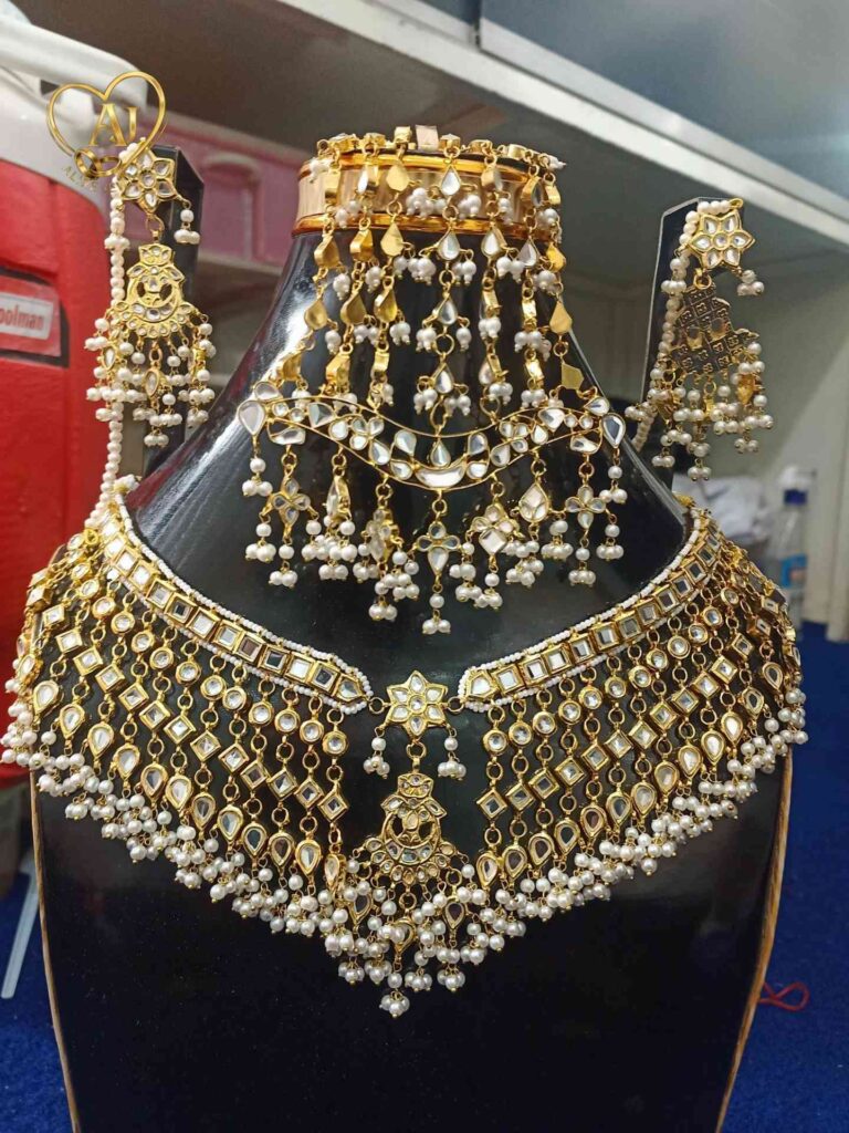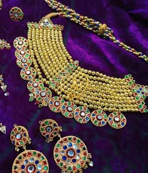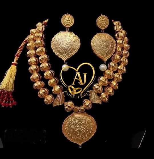 Broad choker with cascading golden bead strings, handcrafted from alloy and dipped in **24 carat gold water** for long‑lasting shine. Comes with matching earrings and headpiece, backed by a **one‑year anti‑tarnish warranty**. Available at **wholesale prices** for brides and special occasions.